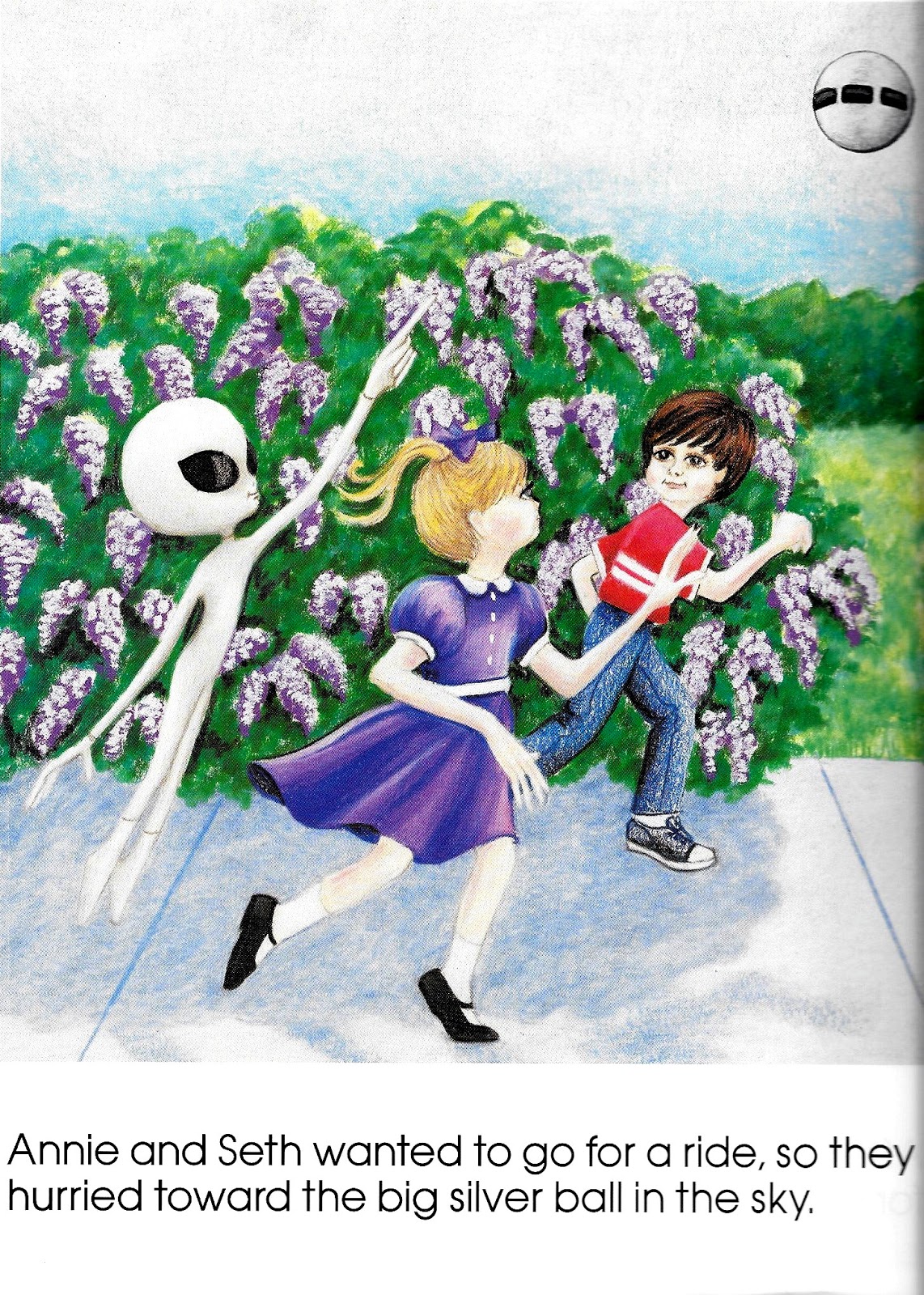 The children’s book describes the adventures of two human children, Annie and Seth. One day while playing outside, Annie and Seth encounter a classic Grey alien (although Haley disputes this description of it) named Ceto. “Ceto cannot talk with his mouth. He talks with his eyes.”