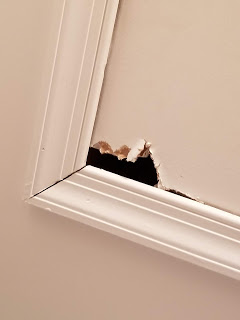 Somehow he managed to jam his ladder into the attic scuttle hatch and door. He had to cut the hatch door to retrieve his ladder. There was no way I was going to help him fix it (“you break it, you bought it…”). So he came the next day to replace it. As any good Stooge would.