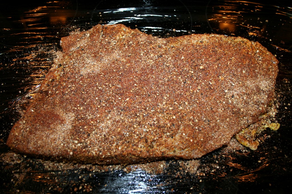 On the sixth day I took the brisket out of the brine and rinsed it off. Then I put it in fresh water for about four hours, changing the water every hour or so. After the brisket was done soaking to leach out some of the salt, I applied a modified beef rub. My normal beef rub consists of salt, fresh ground peppercorn, sugar, onion powder, mustard powder, garlic powder, chili powder, and chipotle powder. Since I already had plenty of salt in the brine I substituted fresh ground coriander seed. First I rubbed plain yellow mustard on the brisket then heavily rubbed the spices on it.