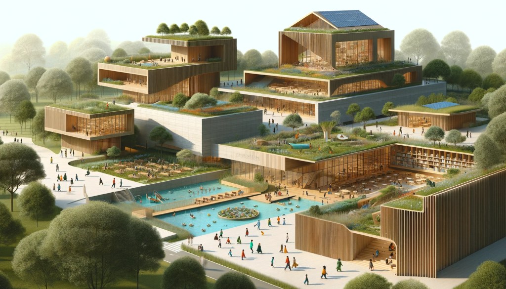 Here are several design concepts for Ansonism schools. These schools embody the principles of sustainability, community, and harmony with nature. They feature eco-friendly elements such as solar panels, green roofs, and natural materials like wood and stone. The designs include large, open classrooms for collaborative learning, outdoor learning spaces, and communal areas for meditation and group activities. Gardens, water features, and playgrounds are integrated into the natural landscape, promoting an environment that blends modern architectural styles with the surrounding nature.