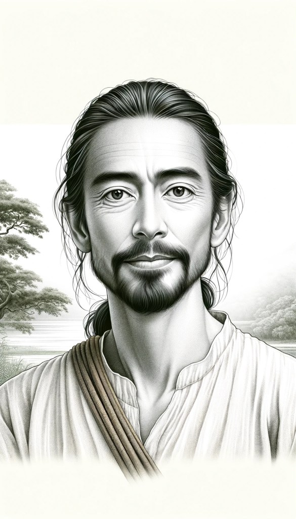 Here is an image of what the founder of Ansonism might look like. This portrait reflects his charismatic and visionary nature, with long dark hair tied back in a ponytail, a neatly trimmed beard, and expressive eyes conveying kindness and insight. He is dressed in simple, eco-friendly clothing, against a background featuring natural elements like trees and a serene landscape, highlighting his deep connection with nature.